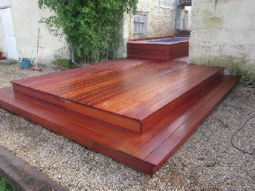 Makossa™ Decking wood comes from West Africa. This wood offers a beautiful reddish-brown colored finish that can provide class and elegance to any outdoor space. Additionally, Makossa™ Decking wood has natural properties that make Makossa™ decking one of the toughest and longest lasting decking materials available on the market today. For example, thanks to its extreme density, Makossa™ decking will stand up very well to outdoor weather and extreme conditions. Additionally, every board is smooth on 1 face and grooved on the other. For instance you can install the grooved face up for your steps which will provide a superior slip resistance, which is important for safety.